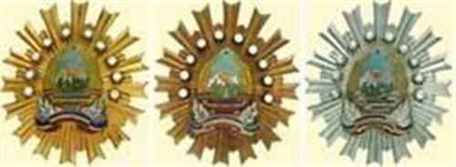 Complete set of 1st - 3rd class; Breast Stars, 1st class metal gilt, 2nd class metal silvered, 3rd class bronze, R.S.R. coat-of-arms in the centre medallion, white stones, with pin back. Rare set awarded only to members of the Securitate.