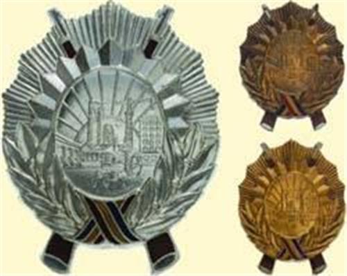 Complete set 1st - 3rd class; Breast Stars, 1st class metal gilt, 2nd class metal silvered, 3rd class bronze, centre medallion with industrial landscape, reverse with pin back. Awarded to police forces.