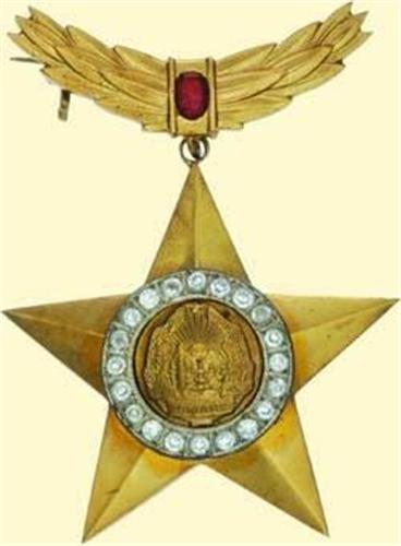 Breast badge, bronze gilt, five - pointed star, in the centre with the socialist crest, surrounded by silver ring with 22 stones; on the star is a laurel wreath, in the centre a ruby red stone. Awarded for outstanding merit in internal and external Romanian politics. The highest Romanian communist order, rarely awarded.
