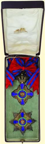 Grand Cross Set: Sash Badge, silver and bronze gilt, both sides dark blue enamelled, no hallmarks, maker's mark RESCH, obverse medallion with an eagle, reverse medallion with Carol 1st cipher, with original crown and suspension ring, and original sash. Breast Star, silver, maker's mark "Joseph Resch Fils Bucarest", no hallmarks, partially gilt and enamelled, brilliant cut, multipart construction, obverse medallion with an eagle, reverse with thin pin back. Together with the original box of issue (Joseph Resch & Fii…Bucarest) with the cipher of Ferdinand Ist.