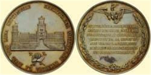 REDEDICATION OF THE ARCHBISHOPRIC IN 1858". Silver medal 1858, 64 mm. Obv. The Archbishopric's building and attributes of the Archbishop, round "REEDIFICAREA MITROPOLIEI INCEPUTA LA ANUL 1858 LUNA SEPTEMVRIE". Rv. Laurel wreath, above eagle; in centre medallion: