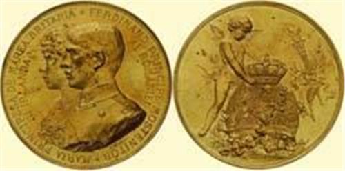 "ROYAL MARRIAGE OF FERDINAND AND MARIA". Bronze gilt medal 1893 by A. Schärff, 50 mm. Obv. Conjoined busts l. of Ferdinand and Maria, "MARIA PRINCIPESA DE MAREA BRITANIÅ SI IRLANDA-FERDINAND PRINCIPE MOSTENITOR AL ROMANIEI". Rv. Eros crowning the royal coat-of-arms of Romania and Great Britain, torch and branch in the field; below, on a ribbon, "29 DECEMBRE 1892 - 10 JANUARIE 1893". Buz. -