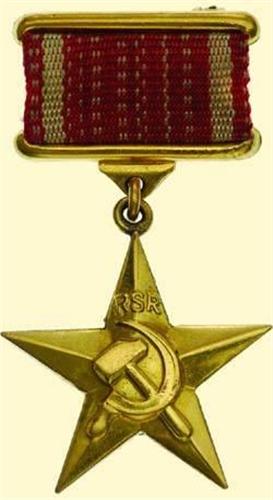 Breast Badge, metal gilt, with five rays, in the centre crossed sickle and hammer, above "R.S.R.", on the reverse "Hero of Socialist Labour". With original suspension ring and original red ribbon with pin back. Awarded for special merits in labour.