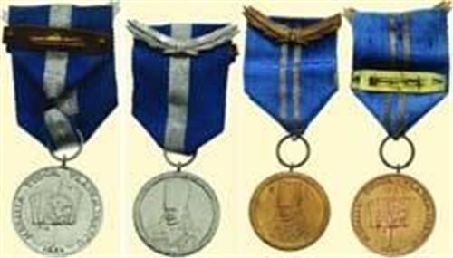 Breast Badges, 1st class metal silvered, 2nd class bronze, with original suspension rings and original blue ribbons, obverse with the bust of Tudor Vladimirescu in the centre within a wreath of oak leaves, reverse with flag and the legend "Medalia Tudor Vladimirescu", "1821".