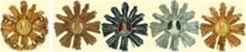 Complete set, 1st - 5th class; breast stars, 1st class gilt with glass stones, 2nd class metal gilt, 3rd and 4th class metal silvered, 5th class bronze, pin on the back.