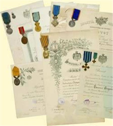 As Sergeant: the "Loyal Service" Medal, 2nd class; Breast Badge, metal silvered, with original suspension ring and original ribbon, together with the awarding document dated August 13th, 1901 and miniature in metal silvered. As Sergeant First Class: the "Carol I Jubilee Medal"; Breast Badge, bronze, with original suspension ring and original ribbon, together with the awarding document dated May 10th, 1906. As Master Sergeant: the "Loyal Service" Medal, 1st class; Breast Badge, bronze gilt, with original suspension ring and original ribbon, together with the awarding document dated July 3rd, 1906. As Sergeant Major: the "Loyal Service" Cross, 2nd class; Breast Badge, bronze silvered, with original suspension ring and original ribbon, together with the awarding document dated June 11th, 1912.