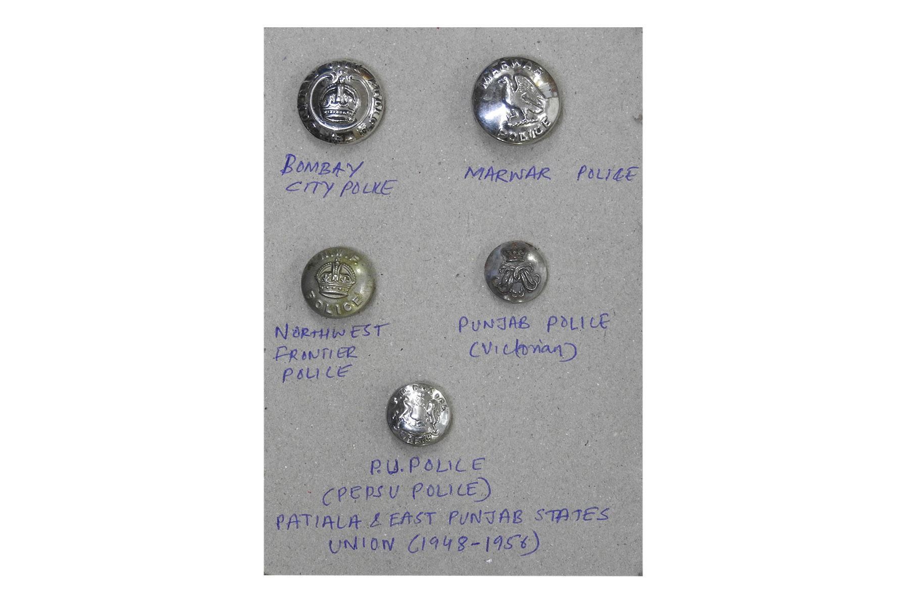 Police Buttons: A set of 5 Pre-1947 police buttons: Bombay City Police, Marwar Police, Northwest Frontier