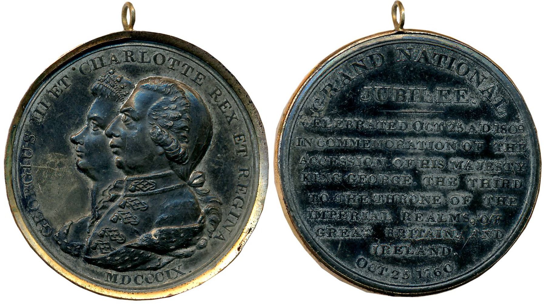 Great Britan, George III, Jubilee White Medal, 23.24g, 1809, Obv: Cojoined bust of Queen and Queen facing left, Rev: Legend within circle. Medal set in Brass ring with suspender. Very fine.