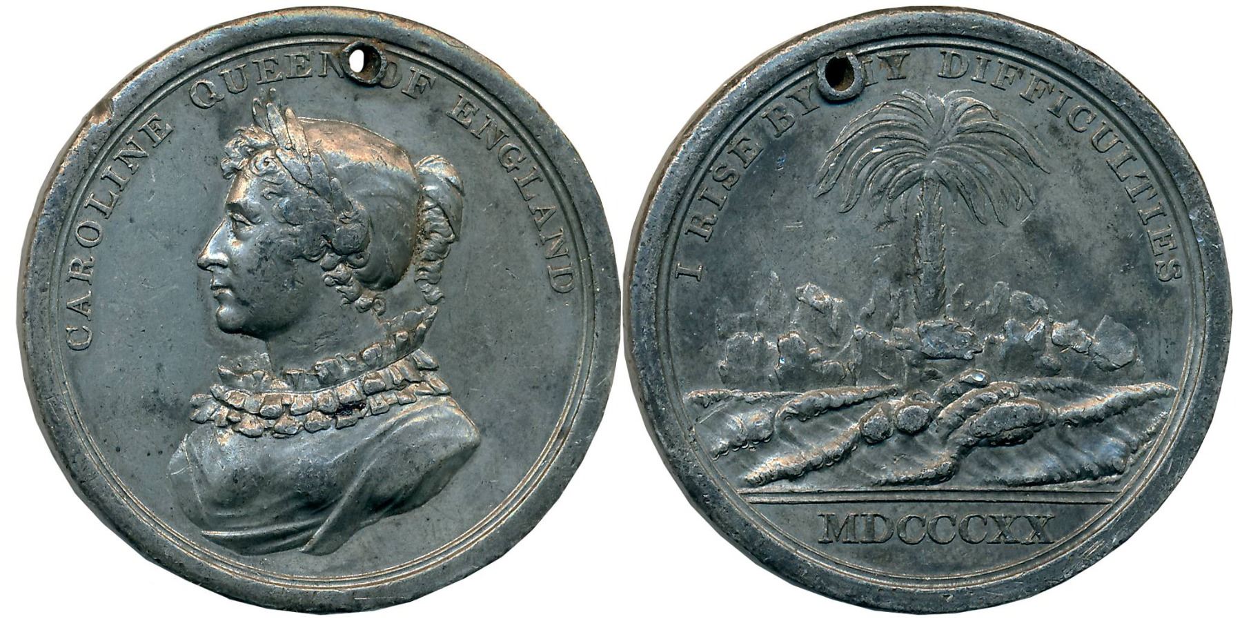 Great Britan, Queen Caroline of England, Medal, Pewter, 26.66g, “Withdrawal of the Pains & Penalties Bill, 1820”, Obv: Bust of Caroline facing left and wearing laurel wreath for victory, Rev: A palm tree rising in the centre, with waves crashing against rocks below and legend arching above. The year (1820) is given in Roman numerals at the bottom. Very fine, rare.