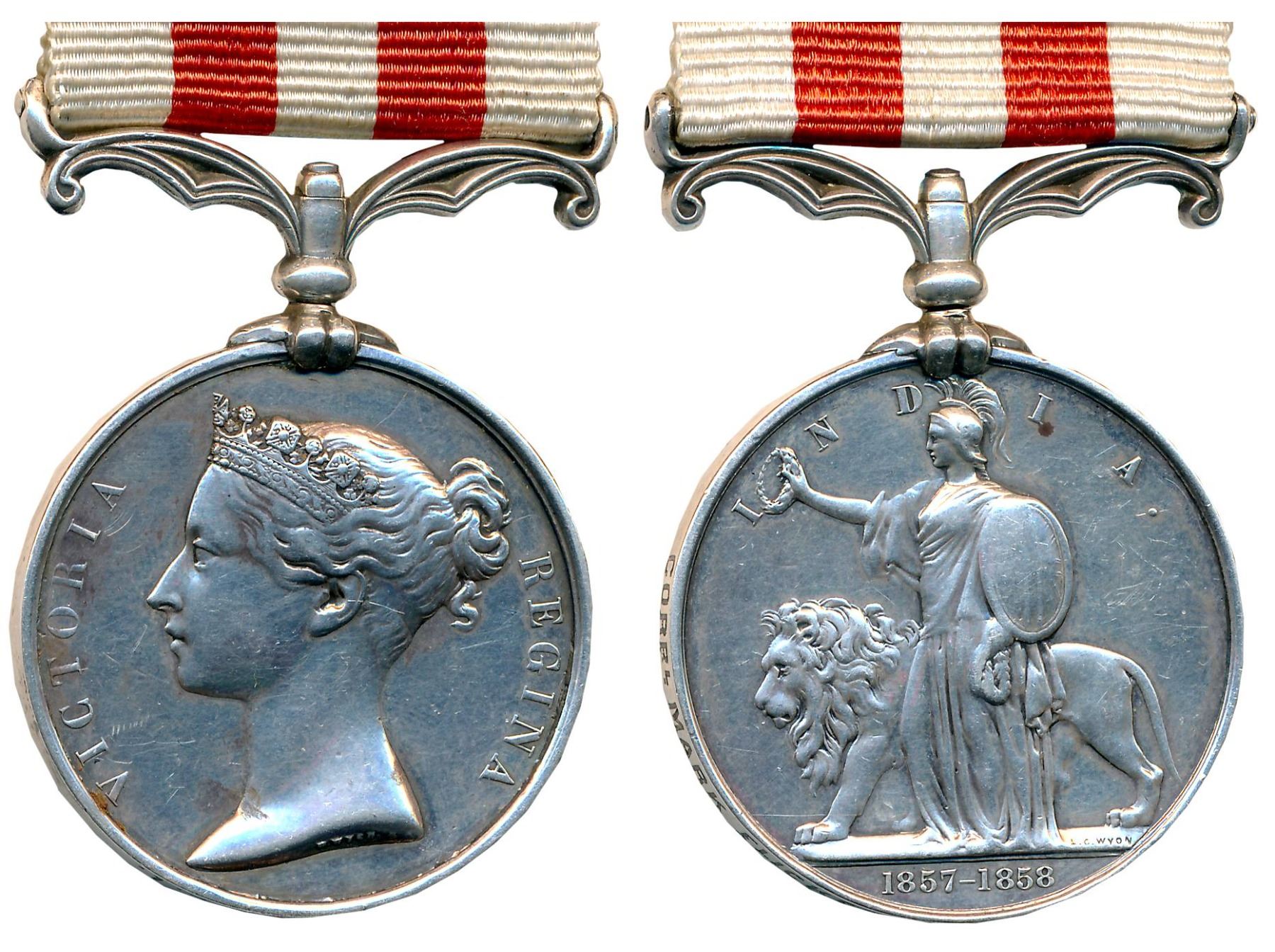 Indian Silver Mutiny Medal, Silver, 35.48g, Obv: Victoria bust facing left, Rev: Goddess of Victory with her Lion, 1857-58. Awarded to “CORPL. MARK FLICKER. 90TH L. I” (MYB# 121). With ribbon. Extremely fine, rare.