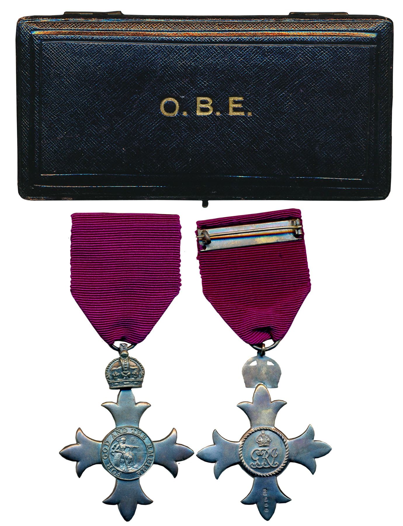 The Most Excellent Order of the British Empire (OBE), Silver Gilt Neck Badge, Obv: Britannia seated in center, inscribed For God and The Empire, Rev: British Crown, legend below (MYB 16). With bow & ribbon. In original box of issue. Very rare.