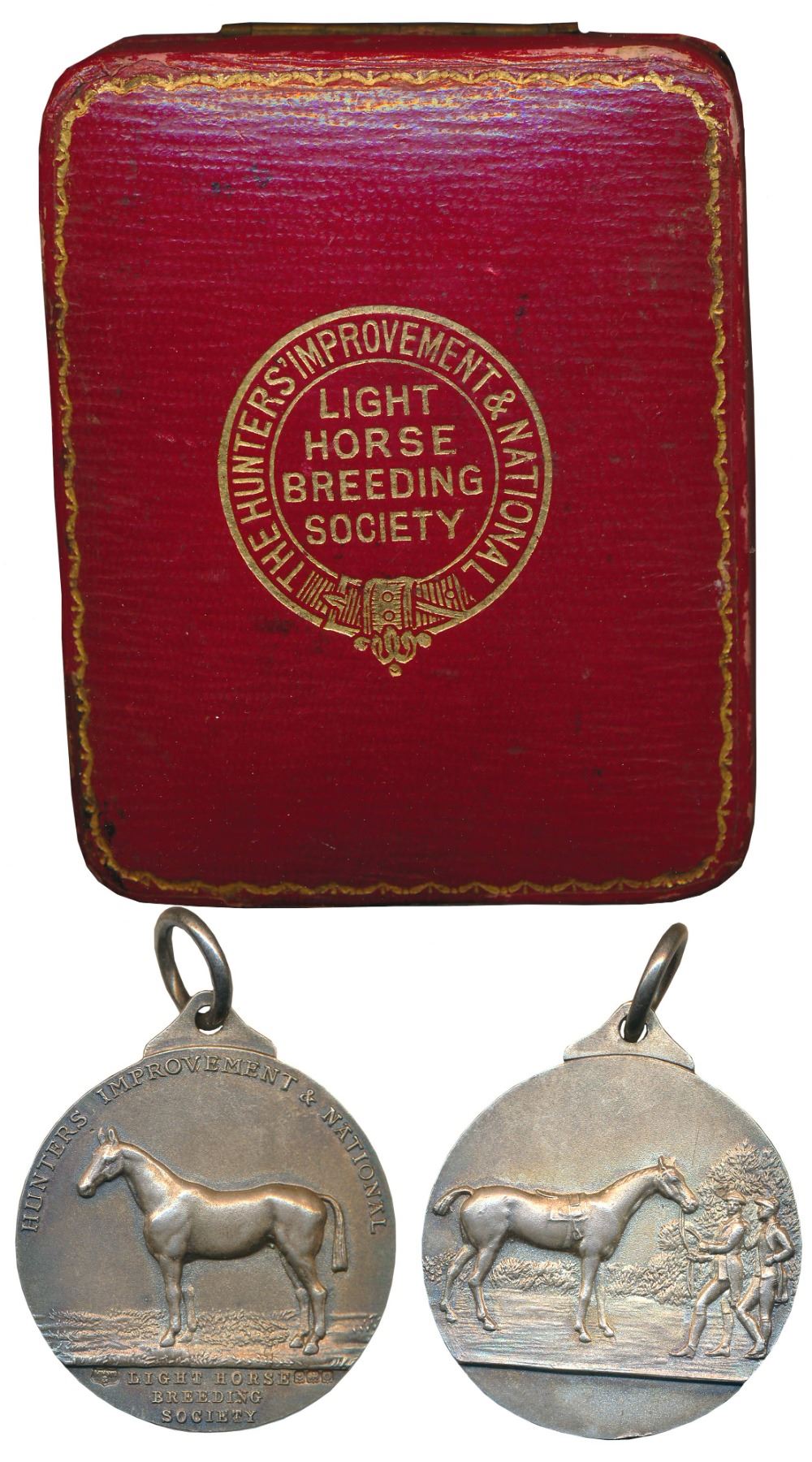 Equestrian Medal, Light Horse Breeding Society, Silver, 54.45g, Birmingham Mint, 1938, Obv: Horse facing left, “Hunters Improvement & National light Horse Breeding Society”, Rev: Horse facing right, two figures facing. With suspender loop and original box of issue. Extremely fine, very rare.