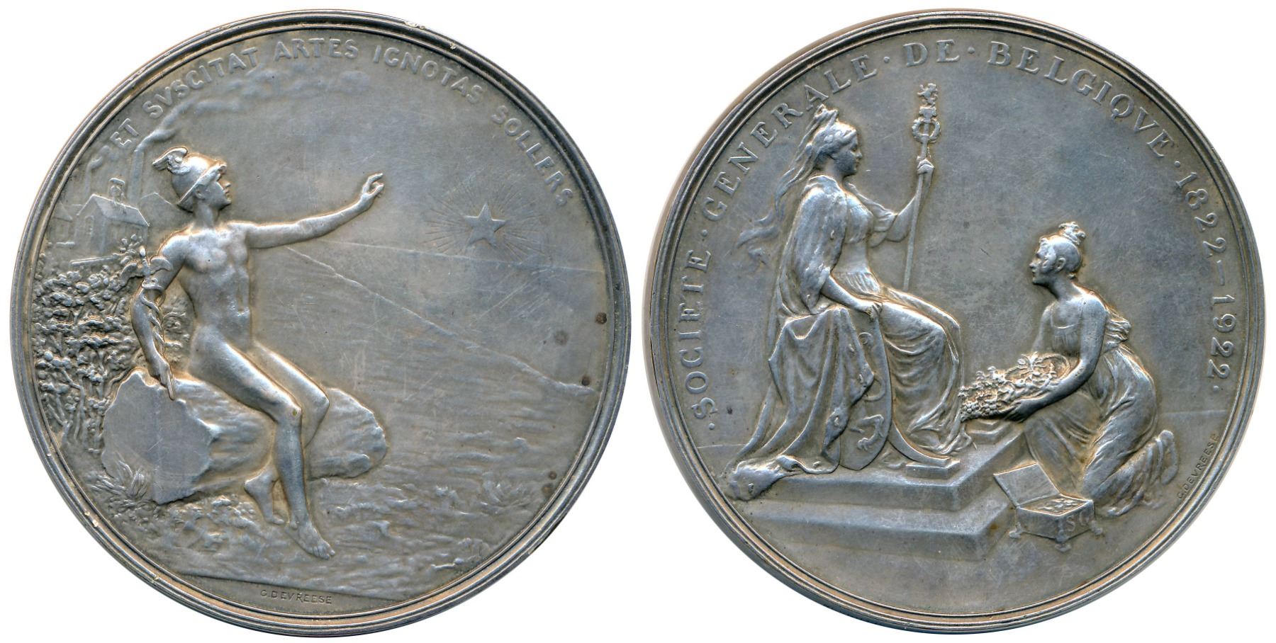 BELGIUM Albert I, Silver Medal, 128.66g, Obv: Legend “SOCIETE. GENERALE. DE. BELGIQVE. 1822-1922” Belgium, enthroned, holds a sceptre. Before her, the Society General kneels, offering her a basket and a box bearing her initials, Signed G. DEVREESE lower right, Rev: Mercury seated on a log by a shore, a factory behind him. On the horizon, the radiant Congolese star. Signed G. DEVREESE in exergue, legend “ET SVSCITAT ARTES IGNOTAS SOLLERS” around. Very fine, very rare.