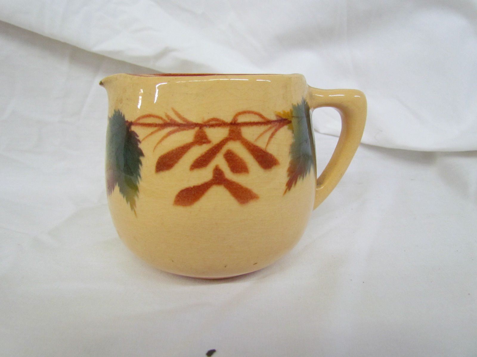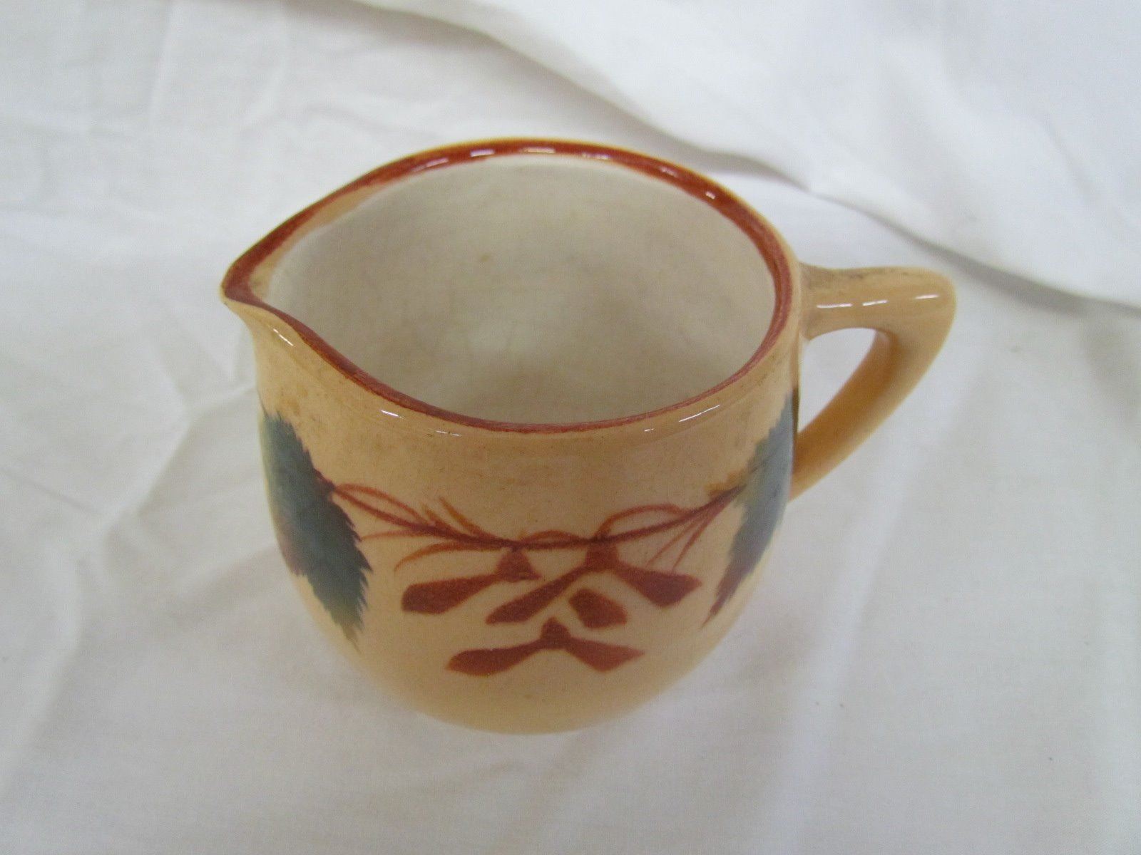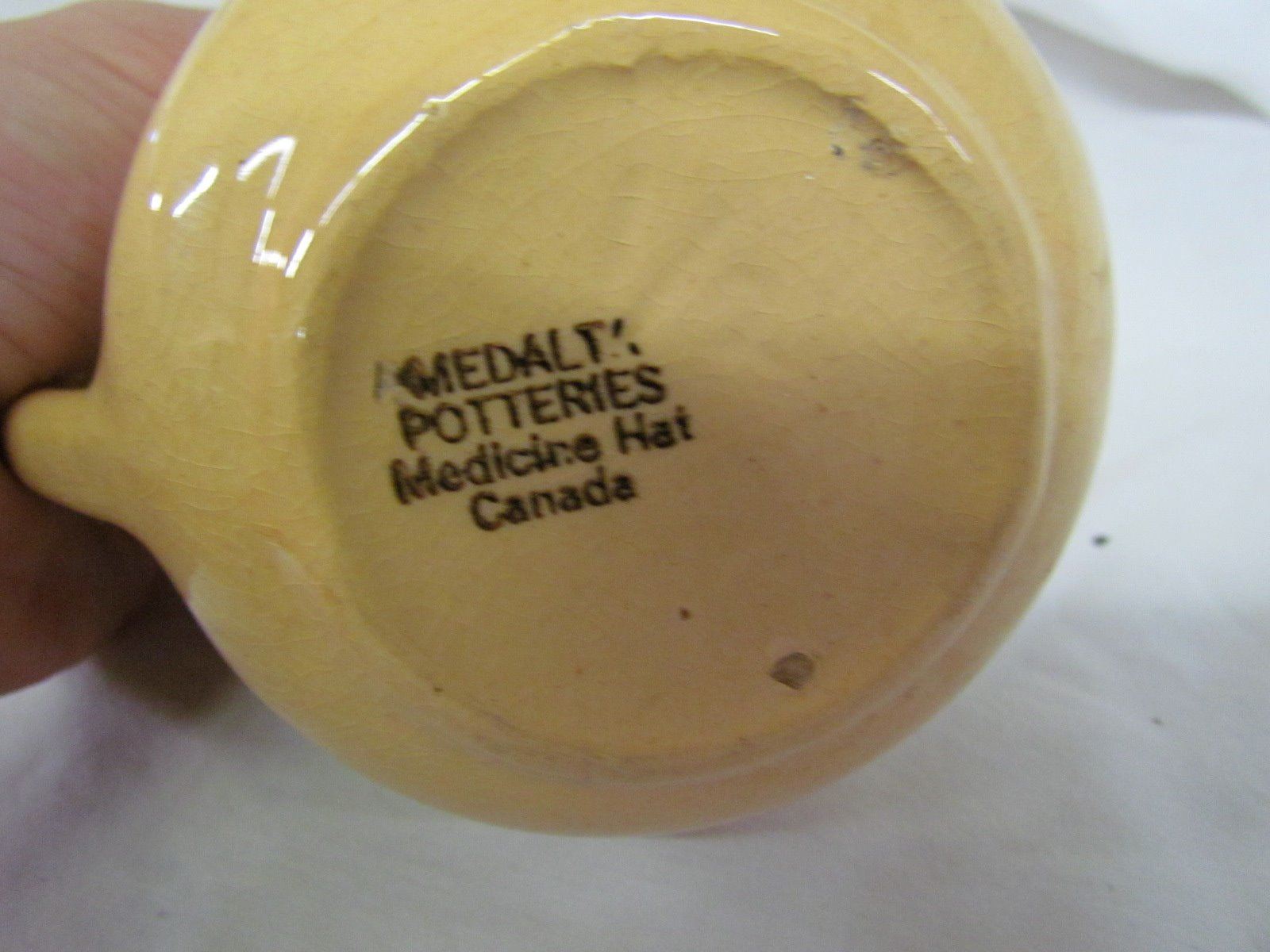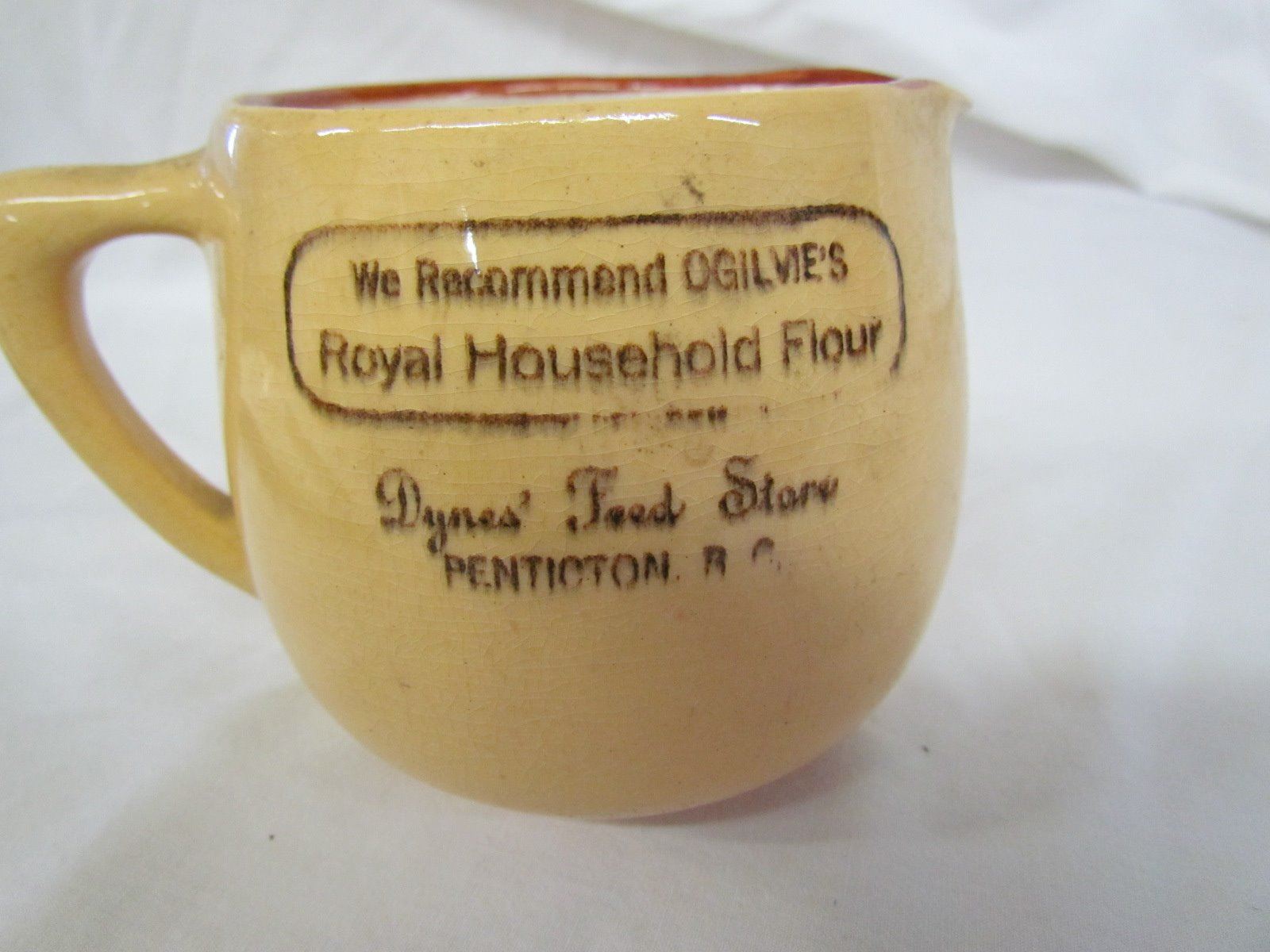 Medalta Creamer Cup with advertising for "Dynes' feed store, Penticton BC"