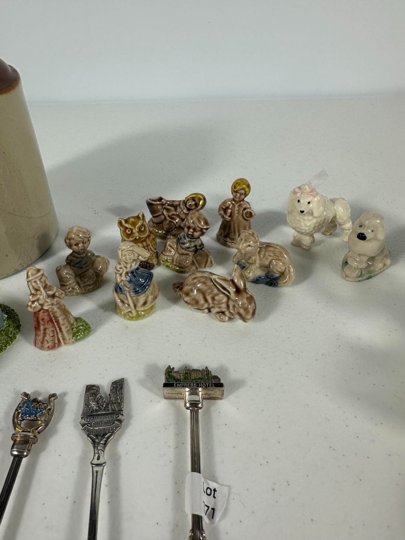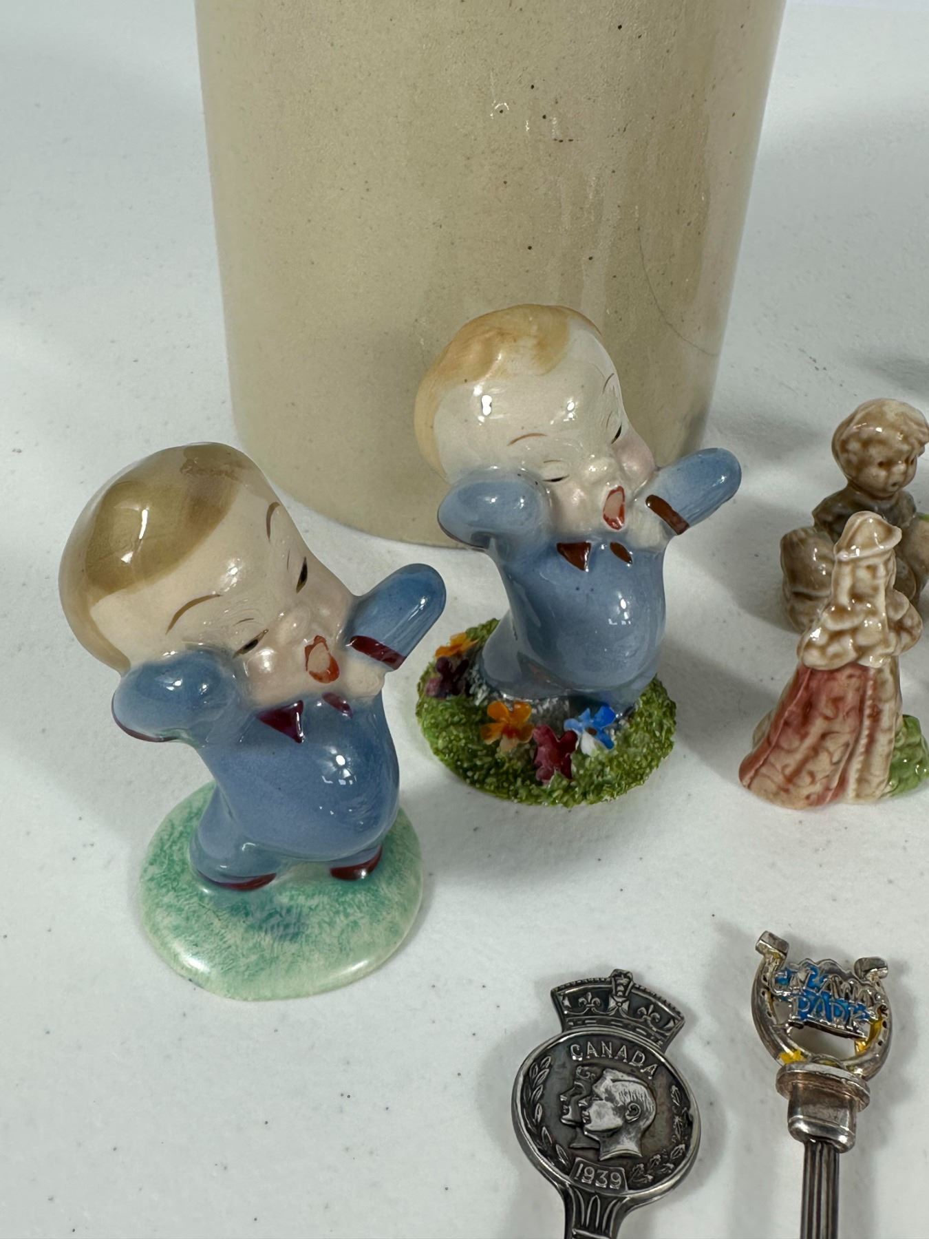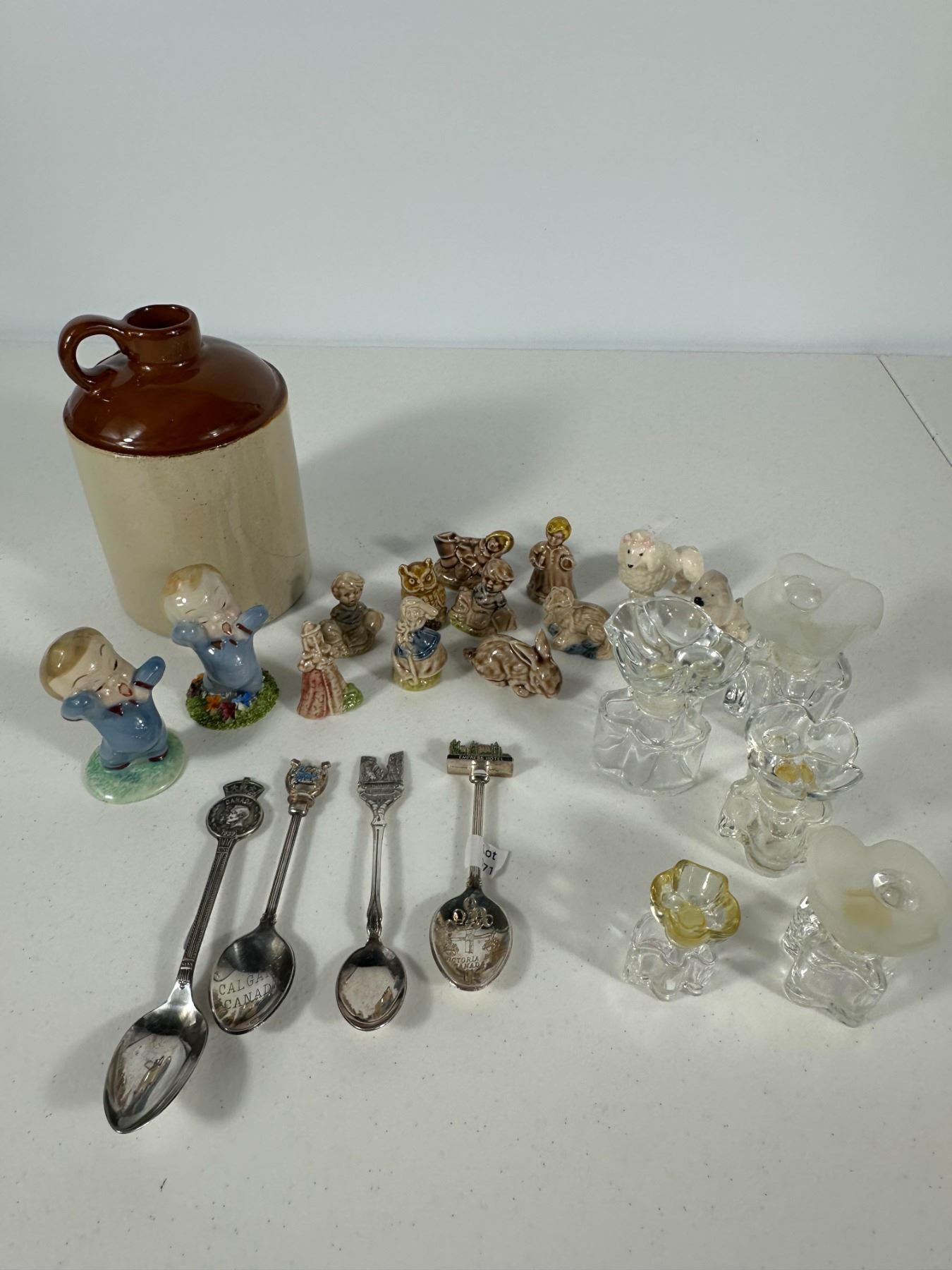 Two‑tone Medalta stoneware jug with assorted ceramic and Wade figurines, vintage perfume bottles, and four vintage souvenir spoons.