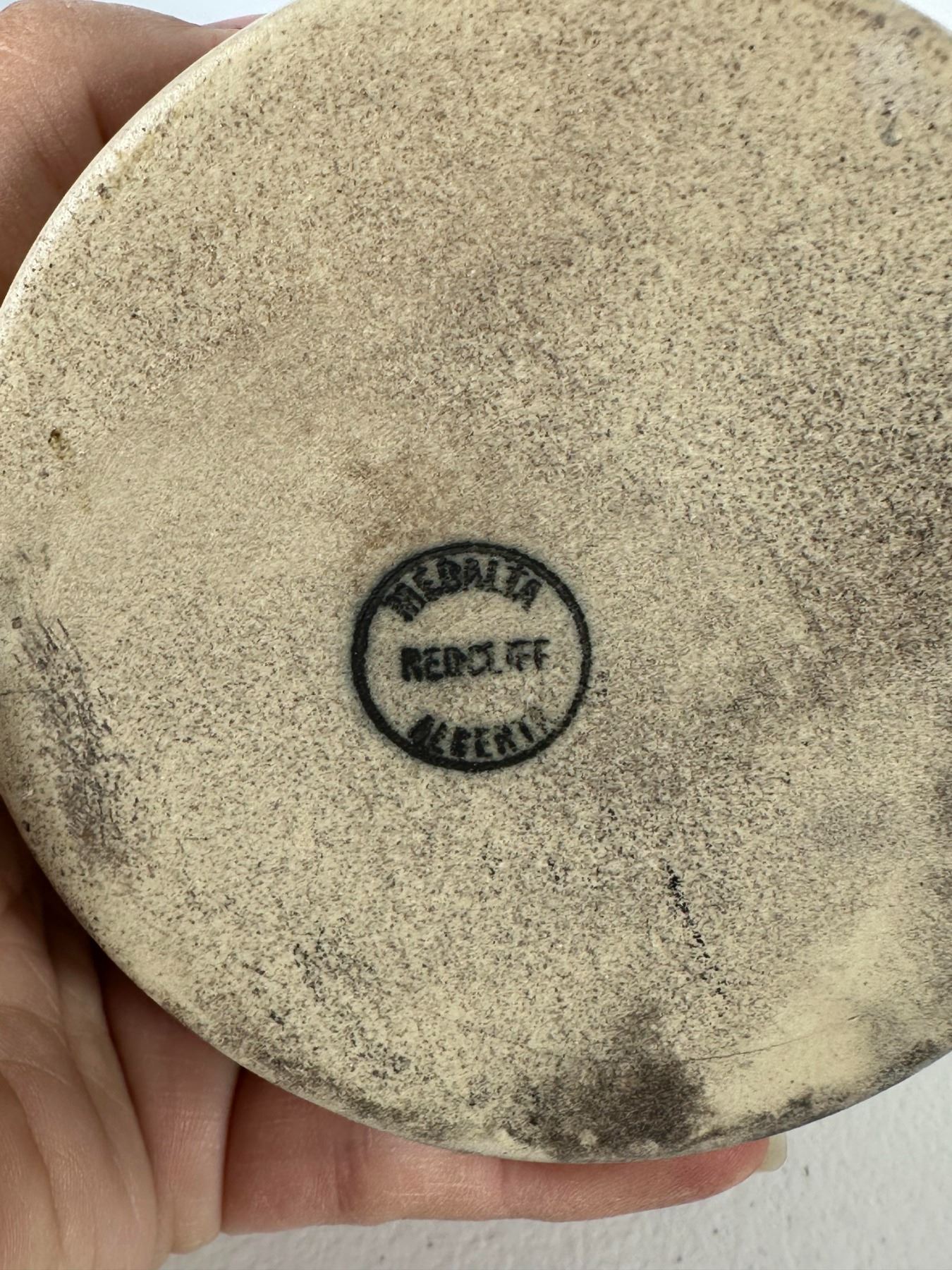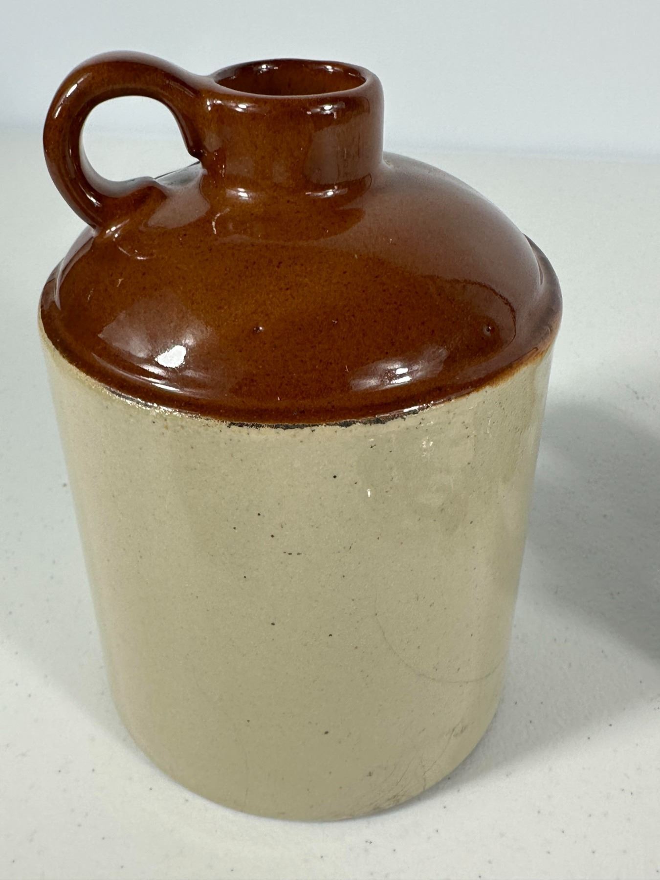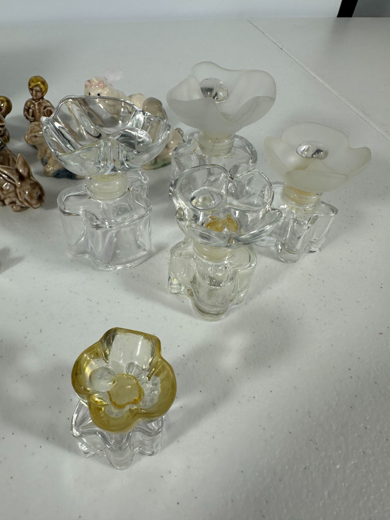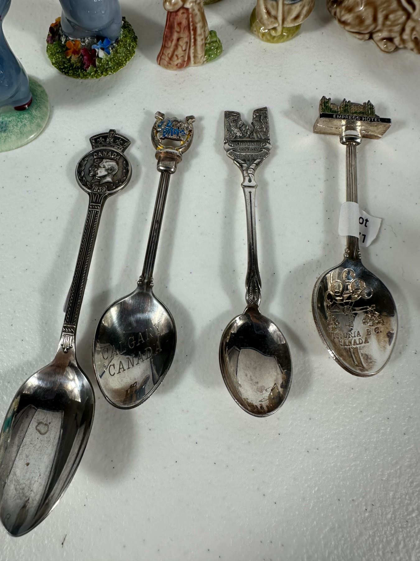 Two‑tone Medalta stoneware jug with assorted ceramic and Wade figurines, vintage perfume bottles, and four vintage souvenir spoons.