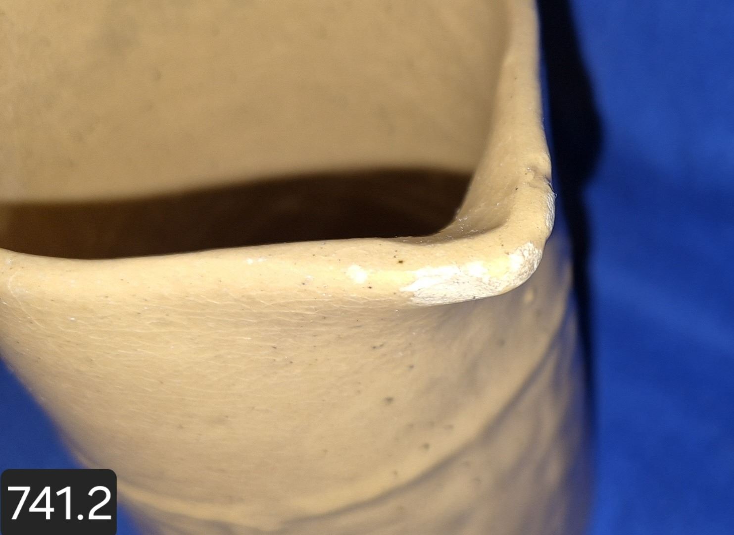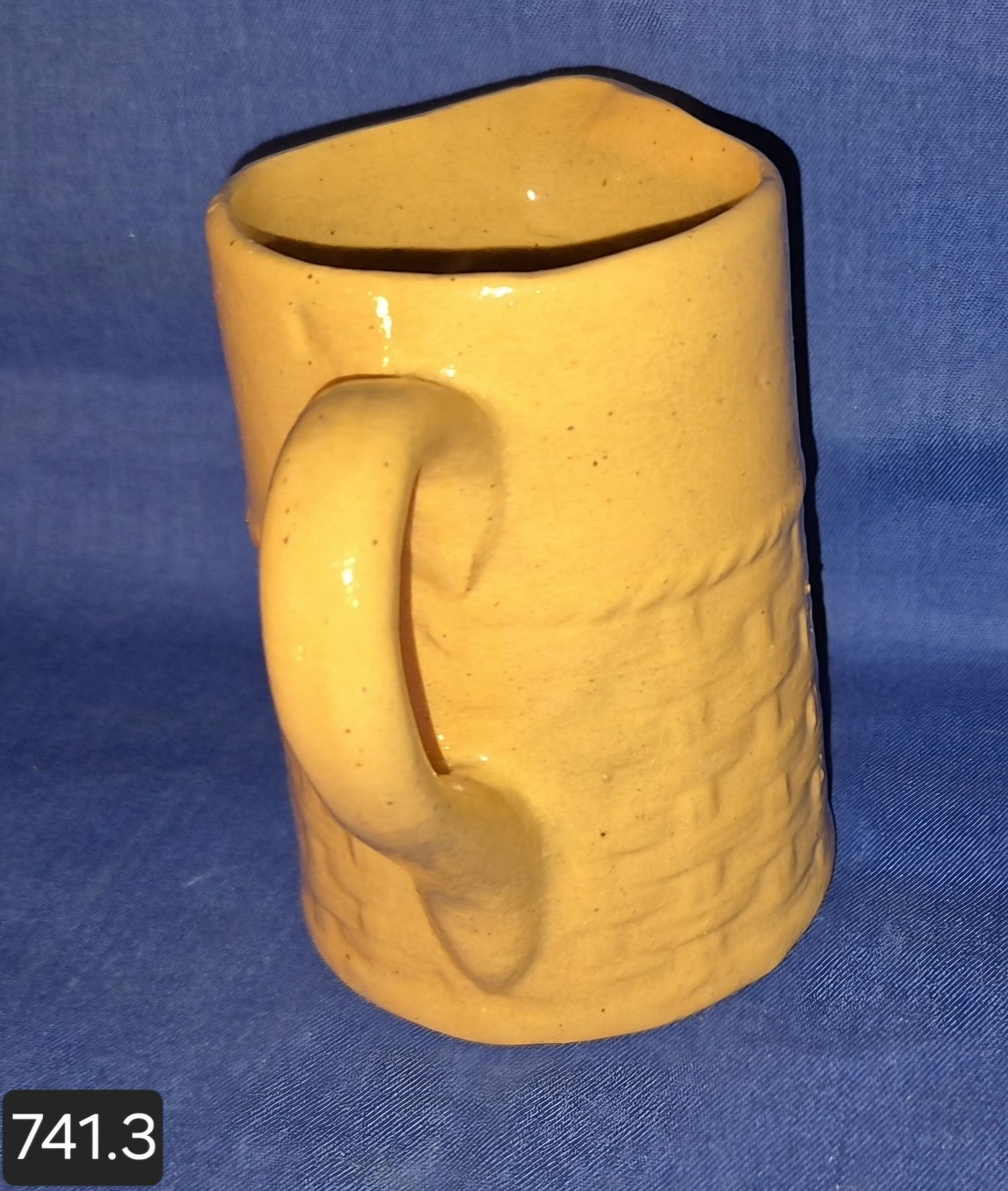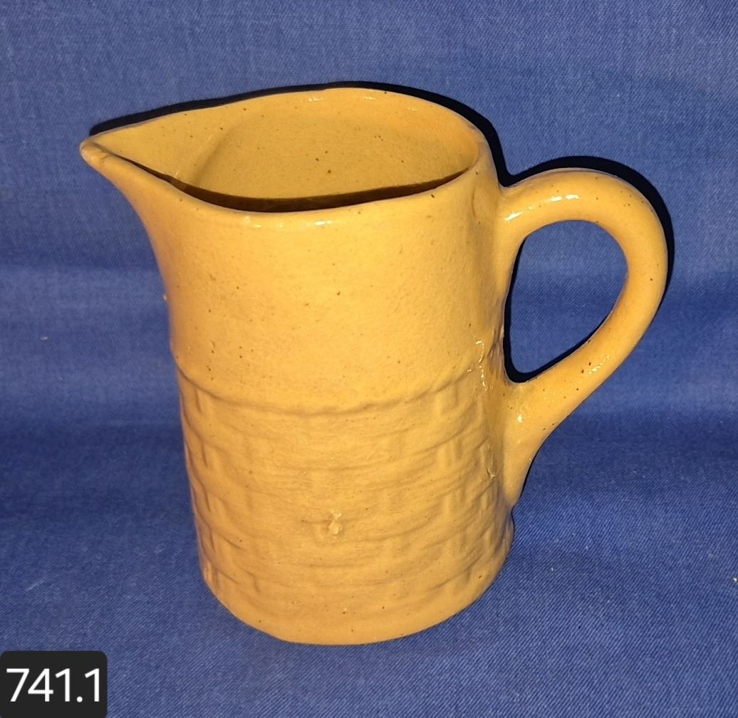 Medalta basketweave pitcher, 5 inches, shallow chip on spout