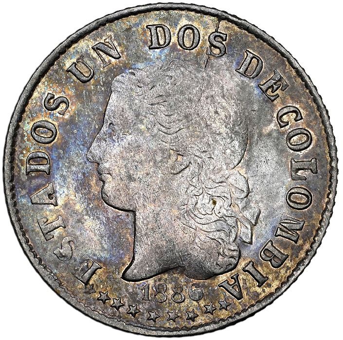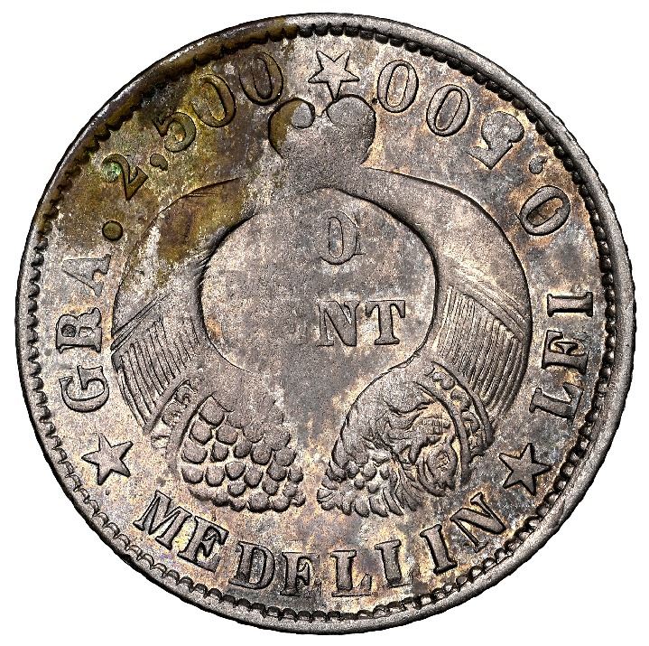 Medellin, Colombia, 10 centavos, 1886, GRA and three stars on reverse, NGC XF details / cleaned. Restrepo-276.4; KM-175.2 a. Deeply rainbow toned with darker patch at 11 o'clock on reverse, scarce semi-key issue. Please use this link to verify the certification number