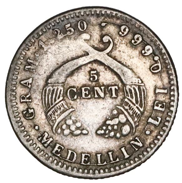 Medellin, Colombia, 5 centavos, 1875, NGC VF details / damaged, Restrepo Plate. Restrepo-265.1; KM-174a.2. Full details with light toning, die-cracks in reverse legend, prominent flan-bulge in front of face (a natural flaw, in our opinion, and not "damage"), with light surface hairlines on that side, very scarce issue. NGC #5938639-019. Pedigreed to the Nueva Granada collection and plated on page 186 of Restrepo's Coins of Colombia (2012) (stated on label).