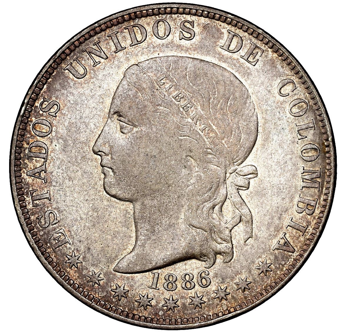 Medellin, Colombia, 5 decimos, 1886, four stars on reverse and accent on DECIMOS, fineness LEI 0.500