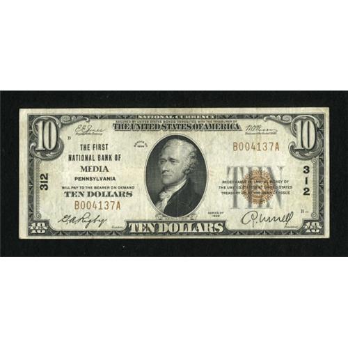 <B>Media, PA</B></I> - $10 1929 Ty. 1 <B>The First NB</B></I> Ch. # 312<BR> Twenty-two small size are listed in the census on this avidly collected Philadelphia suburb. This bright <B>Very Fine-Extremely Fine</B></I> is a worthy addition to the census.<BR><I>From The Kansas City Collection</B></I><BR><BR><b>Shipping:</b> Coins & Currency (<a target="_blank" href="http://www.heritageauctions.com/common/shipping.php">view shipping information</a>)