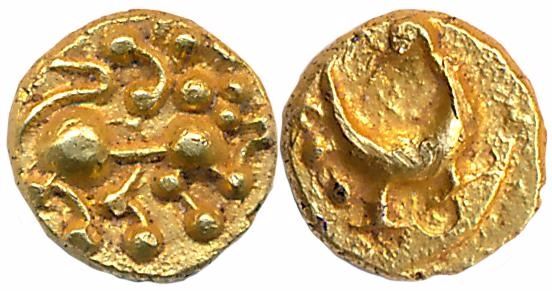 Kadambas of Hangal, Gold Fanam, 0.38g, Obv: Lion walking to right facing back, Rev: Peacock facing right. Extremely fine, very rare.