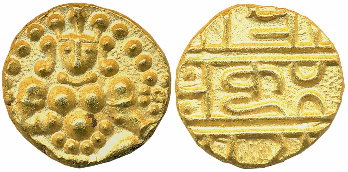 Naykas of Chitradurga, Gold Durgi Varaha, 3.21g, Obv: Seated Bal Krishna, Rev: Devnagari legend "Krishnadevaraya" (Mitch# 882). Extremely fine.