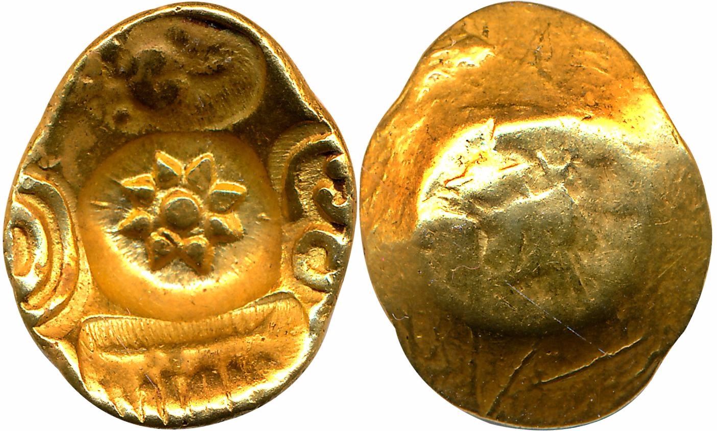 Yadavas of Devagiri, Singhanadeva, Gold Padma Tanka, 3.81g, Uniface, Punch Marked, Lotus in centre, 2 punches of Kannada letter ‘Shri’, 1 punch of Shankha and 1 punch of Devnagari legend "Singhana" (Mitch K&A #287). Extremely fine, scarce.