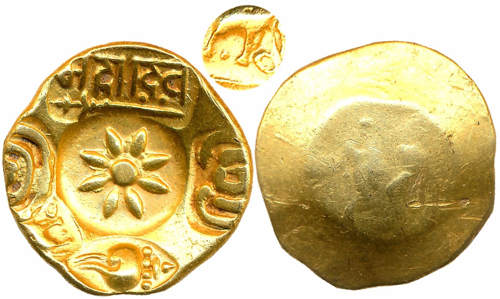 Yadavas of Devagiri, Mahadeva, Gold Padma Tanka, 3.80g, Uniface, Punch Marked, "Elelphant Punch" type, Lotus in centre, 2 punches of Kannada letter ‘Shri’, 1 punch of Elephant, 1 punch of Devnagari legend "Mahadev" (Mitch K&A # 288). Extremely fine, extremely rare./nlPadam Tanka’s with extra punch of Elephant are extremely rare and very rarely appeared in auctions.