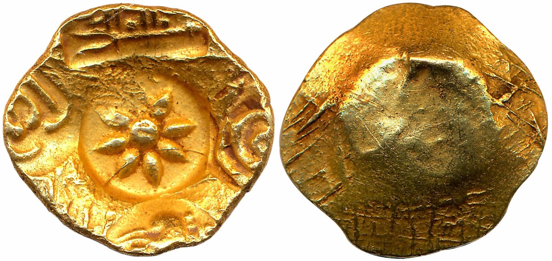 Yadavas of Devagiri, Ramchandradeva, Gold Padma Tanka, 3.82g, Uniface, Punch Marked, Lotus in centre, 2 punches of Kannada letter ‘Shri’, 1 punch of Shankha, and 1 punch of Devnagari legend "Sri Ram" (Mitch K&A #289). Very fine, scarce.