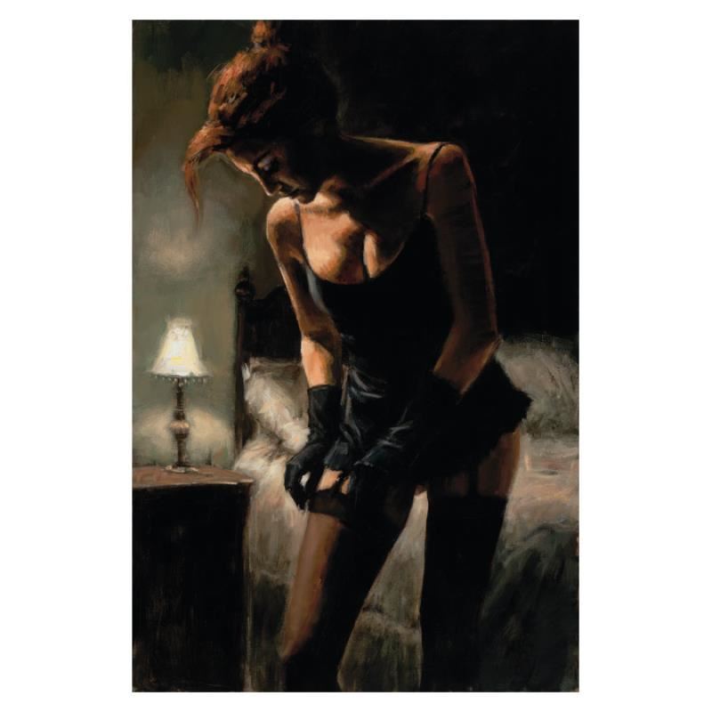 "Medias Negras" is a hand textured limited edition giclee on canvas board by Fabian Perez. The piece is numbered and hand signed. Includes a certificate of authenticity. Measures approximately 16.5" x 11"