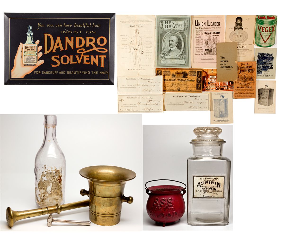 An exciting assortment of different medical advertising items and ephemera including: 1) A cast iron cauldron, painted red, embossed “S.S.S./ For The/ Blood” on front and back. This item was used as a string holder in a shop; the string would feed through the bottom of the cauldron, allowing the shopkeeper to easily tie up packages while simultaneously advertising SSS tonic, which was meant to promote strong blood and circulation. Swift’s Southern Pacific Company opened in 1826 and still operates today. This cauldron dates to the early 1900s. 2) A 12” tall, with lid, by 5” wide rectangular countertop display jar. The under-glass label is printed “Dr. Simmons/ Compound/ Aspirin/ Laxative Tablets/ For Pain/ C.F. Simmons Medicine Co./ J.H. Zeilin & Co./ St. Louis, Mo.”. The top is ornate pressed glass. No maker’s mark. c.1920. 3) A 4.75” by 9.5” “Sandholm’s Eczema Lotion and Dandruff Cure” pamphlet. C.1906. 4) A 9” by 13” tin advertising sign for “Dandro Solvent”. Gold ink trim and detail on a navy background. This sign is marked on the back, 'Made by The Elwood Myers Co. - Springfield, Ohio'. Notice that the sign has the paper backing that could be folded to be a self standing sign; however, this sign has never been bent to do that. Excellent all original condition you will not want to miss adding this barber related advertising sign to your own personal collection. c. 1920-1930. 5) 16 December 1906 Sunday Magazine full-page advertisement for “Dr. Miles’/ -Anti-/ Pain Pills”. Full color, 10.25” by 14.25”. 6) Pamphlet for “Sex-ine Pills” dated 1905 by Peal Medicine Co. 7) Small 4.5” by 7.5” ad for Fairy Soap. Vaccination certificates, drugstore invoices, a “Vegex” cookbook, a self-diagnosis pain chart, ads for “Fairy Soap”, “Robinson’s Thermal Bath”. 8) A brass mortar with brass pestle. Unmarked. 9) A 3.25” long miniature metal hammer, embossed “See’s Candies” on the side. Used for breaking peanut brittle. 10) 8” clear glass bottle, light purple coloration, with remnants of a label for “Magnesia”. Slug embossed “Citrate/ of/ Magnesia”. L-shaped crack in mouth and neck.
