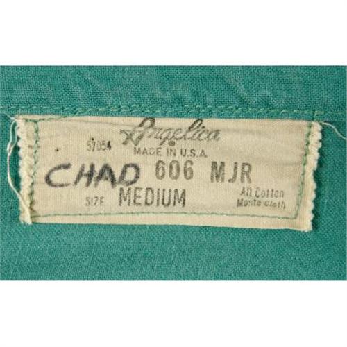 <B>"Medical Center" Chad Everett Screen-Worn Costume.</B></I> Dr. Joe Gannon's green full-length cotton surgical gown with back ties at neck and waist marked within "Chad" and a cloth surgical mask worn at the University Medical Center by actor Chad Everett on <I>Medical Center</B></I> (1969-76). Acquired from Metro-Goldwyn Studios, where the series was shot. <I>Authenticated by the world's foremost curators of television artifacts, The Comisar Collection of Beverly Hills.</B></I><BR><BR><b>Shipping:</b> Clothing, Costumes & Jerseys (<a target="_blank" href="http://www.heritageauctions.com/common/shipping.php">view shipping information</a>)