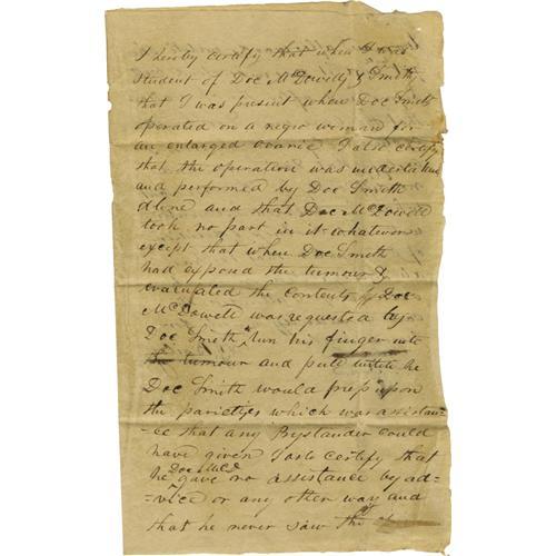 <B>(Nineteenth Century Medicine) Autograph Document Signed "<I>F. J. Bailey</B></I></B></I>", two pages, 8 x 13 inches, no place, no date, circa 1830? , a deposition concerning the conduct of two doctors attending the removal of an inflamed ovary from "<I>a negro woman</B></I>". Bailey writes: "<I>...when I was a student of Doc McDowell & Smith that I as present when doc Smith operated on a negro woman for an enlarged ovarie sic . I also certify that the operation was undertaken and performed by Doc smith alone and that Doc McDowell took no part it whatever except that when Doc smith had exposed the tumor & evacuated the contents Doc McDowell was requested by Doc smith to run his finger into the tumor and pull while he Doc Smith would press upon the illeg. which was assistance that any Bystander could have given. I also certify that he Doc McD gave no assistance by advice or any other way and that he never saw the woman afterwards until she got well and it was understood both before and after the operation that the case as Doc Smith's exclusively... </B></I>" Usual folds, irregular margins, else very good.<BR><BR><b>Shipping:</b> Flat Material, Large (<a target="_blank" href="http://www.heritageauctions.com/common/shipping.php">view shipping information</a>)