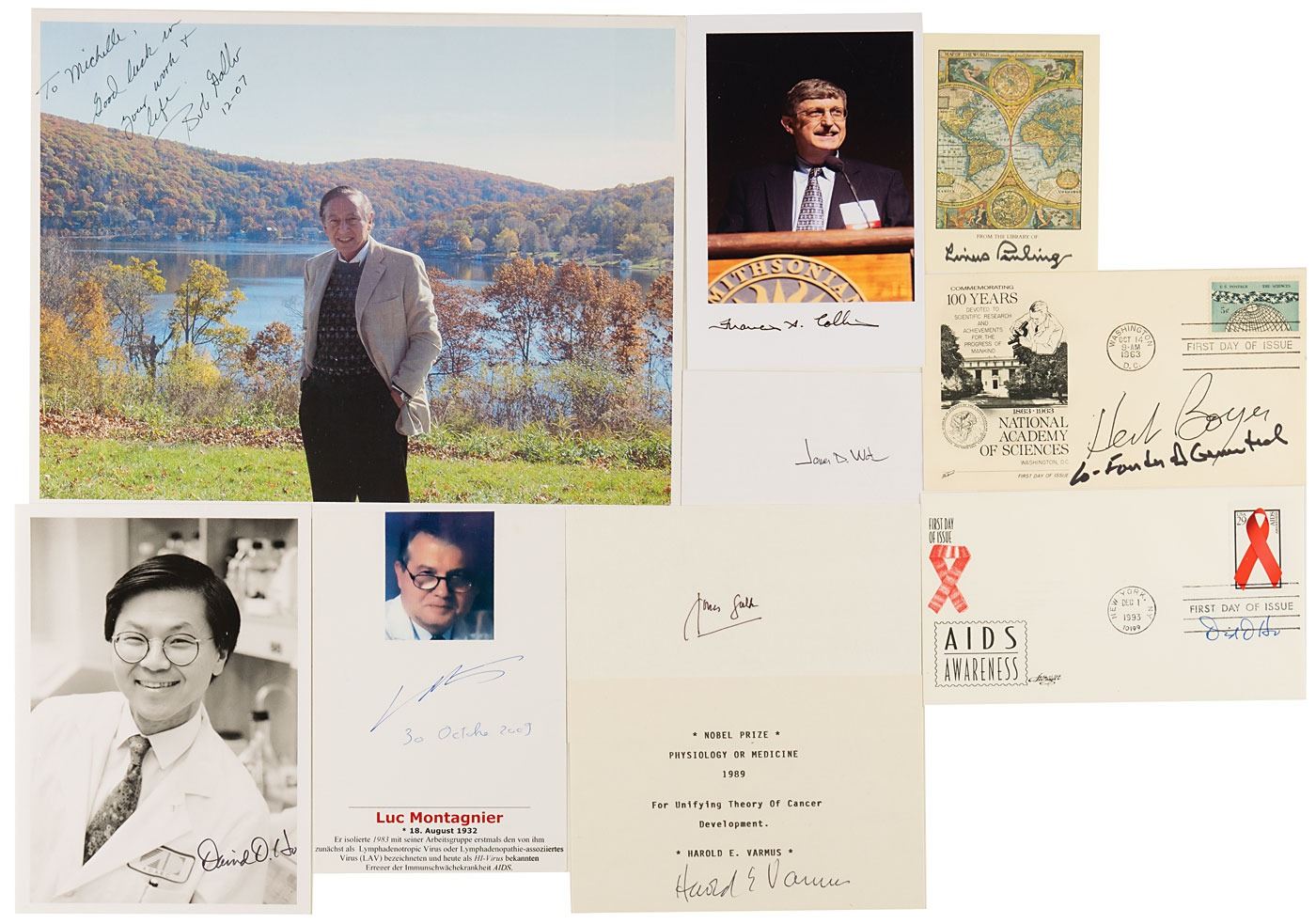 Group of ten items signed by noted medical researchers, including: Jonas Salk (signature), James D. Watson (signature), Linus Pauling (bookplate), Harold E. Varmus (signature), Herbert Boyer (FDC), Luc Montagnier (signature), Robert Gallo (SP), Francis Collins (SP), and David Ho (SP and FDC). In overall fine condition. Accompanied by the original transmittal letter for the Salk signature.