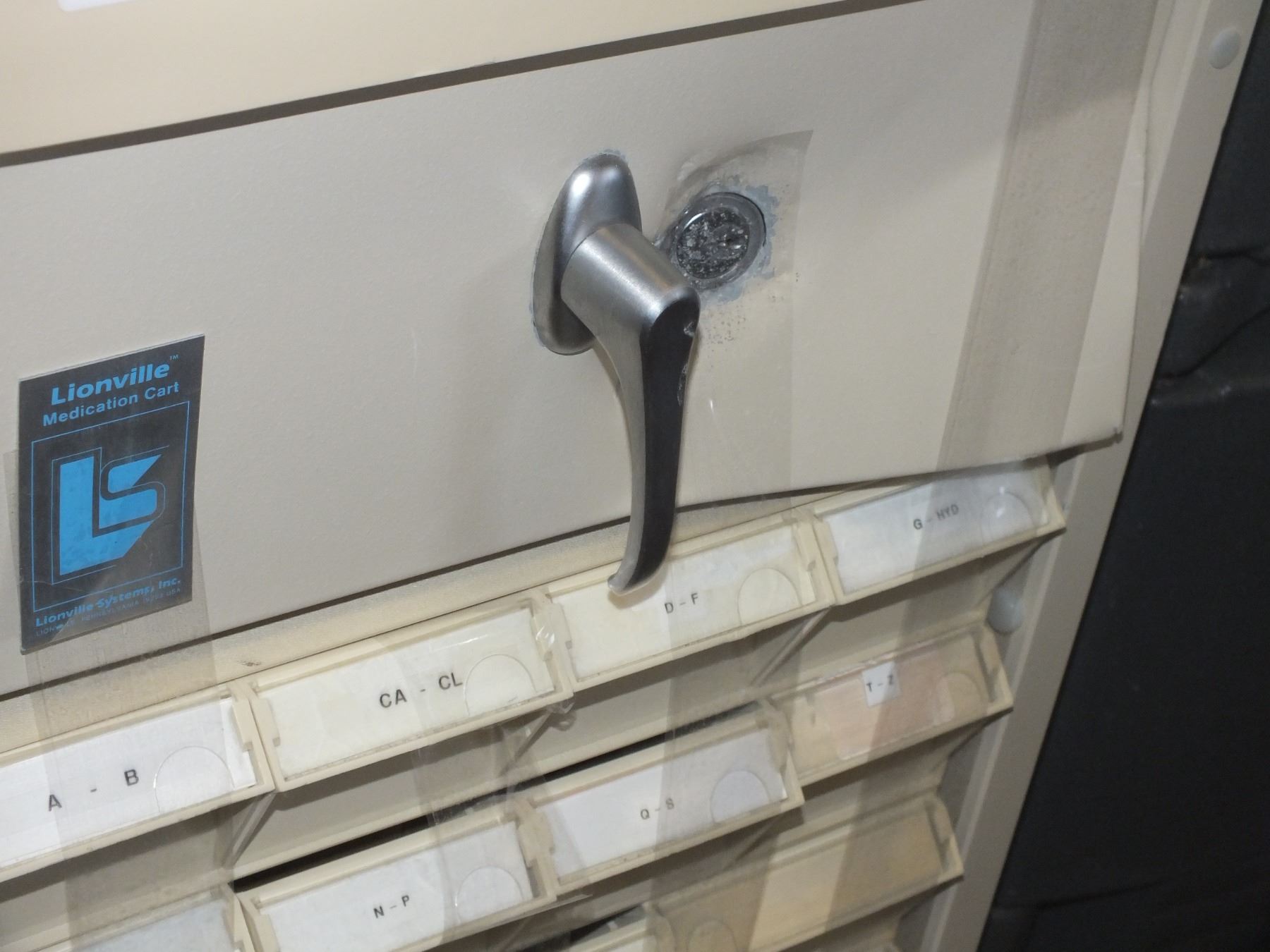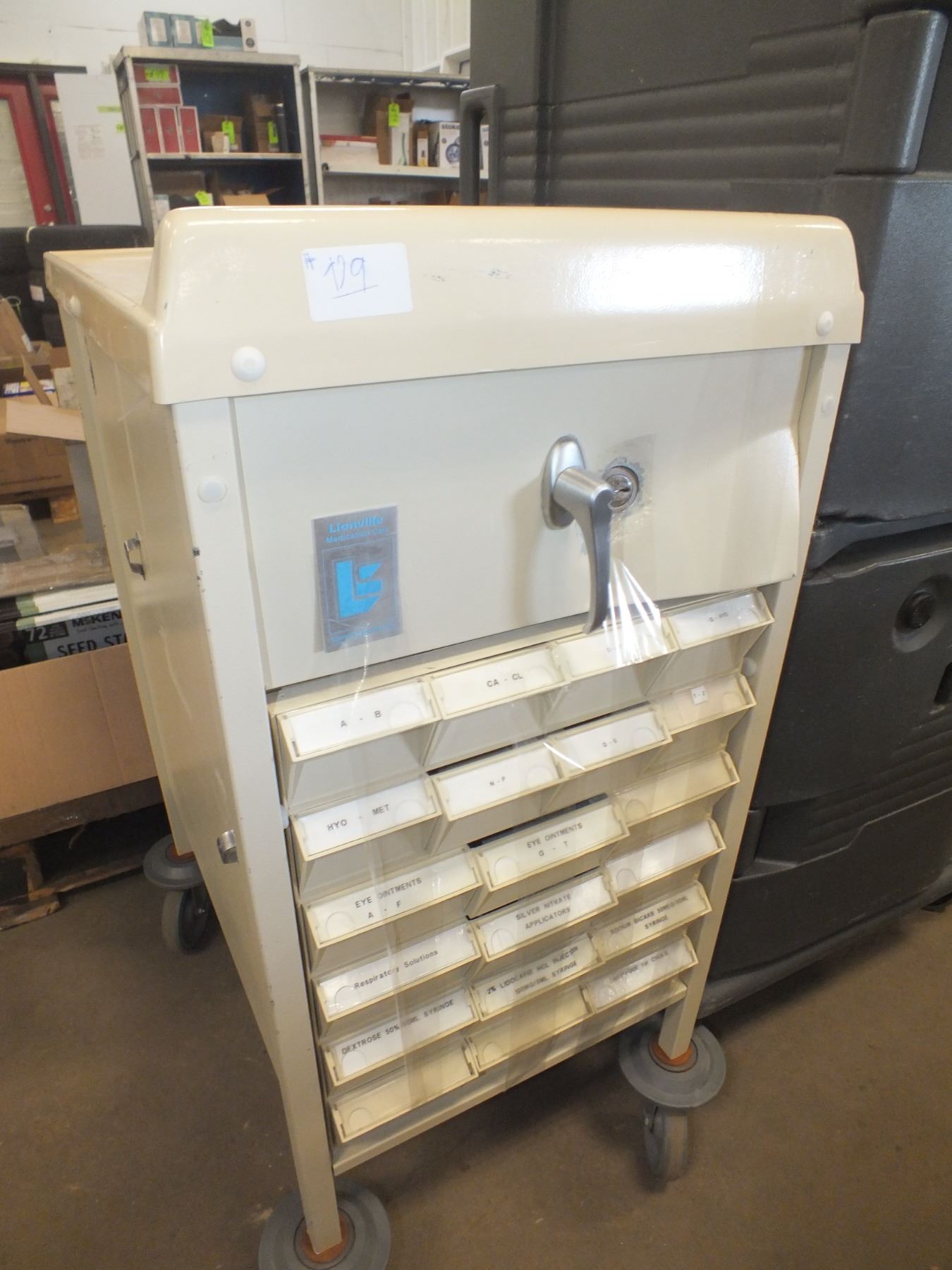 Medical Storage Cart On Wheels, 18"w 25"d 41"h, damaged, no key...used