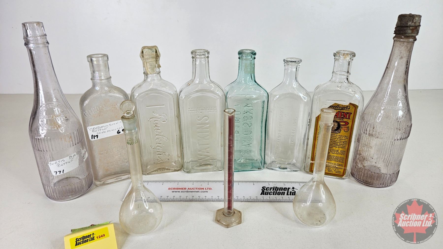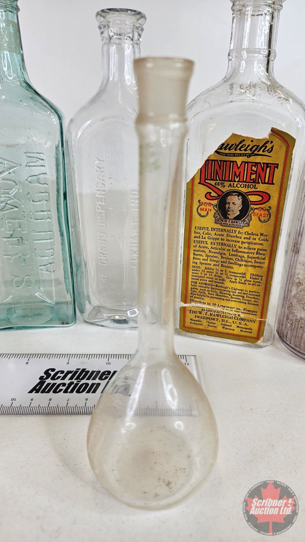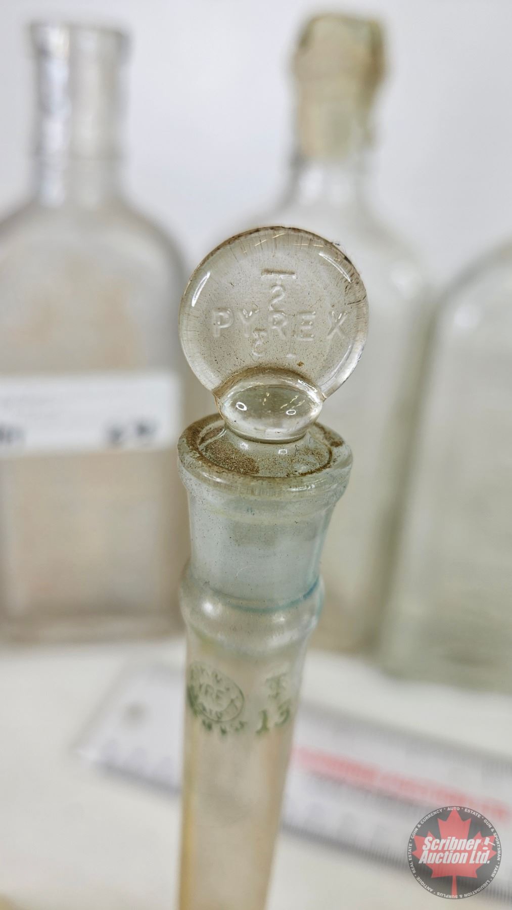 Medicine Bottles (8) w/ Graduated Cylinder & Volumetric Flask