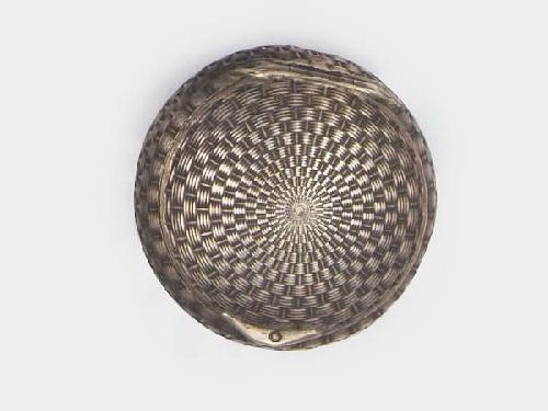 Silver, 31 g. Round form with hinged cover. On the whole surface there is wickerwork decoration. Marked: Vienna, late 19th century, Georg Scheid. Neuwirth: II/180.