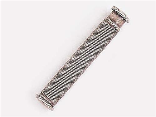 Silver, cylindrical form, guilloche decoration, circa 1930, weight: 16.5 g.