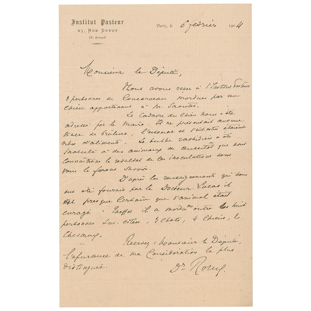 Two items: ALS, in French, signed “Dr. Roux,” one page, 5.25 x 8.25, Institut Pasteur letterhead, February 6, 1904. Roux writes to representative about the examination of a rabid dog. Accompanied by a full translation; and an ink signature, “Professor A. Neisser, Breslau…Deutschland,” on an off-white 3.5 x 3 lined slip. In fine condition, with light toning to both items.