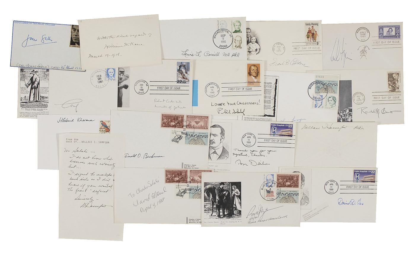 Twenty-five signed items, consisting of signatures, FDCs, and commemorative covers, each signed by a different scientist or doctor. Signers are: Jonas Salk, William W. Keen, Lewis Cariell, Frank B. Colton, Carl Djerassi, Mehmet Oz, J. Robert Cade, Phil Sokoloff, Louis Lasagna, Ronald Evans, Har Khoram, Arnold O. Beckman, Tom Diethe, Wallace Sampson, David Elkin (ins), Ronald Myers, David D. Ho, Lap-Chee Tsui, David Satcher, Tom Starzl, Matthew Warpick, Francis Conley, Ruth Faden, Maria I. New, and Ruth Macklin. In fine overall condition.