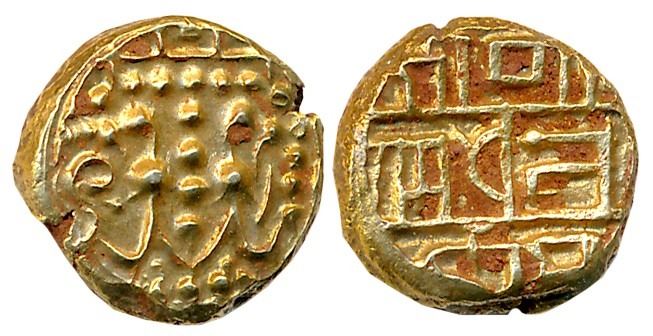 Alupas of Udipi / Alvakheda, Gold Gadyana, 3.56g, in the name of ‘Pandya Dhananjaya’, Obv: Alupa dynastic emblem - two vertical Fish above the lotus, beneath the umbrella, flanked by a conch-shell (Shankha) and a dagger (Katar), Rev: Nandi nagari legend “Sri Pa / ndya Dhanam / jaya” in three lines with dividing lines, all within a circular border (G Prabhu# 39, K. Ganesh# 4.18). Extremely fine, very rare.