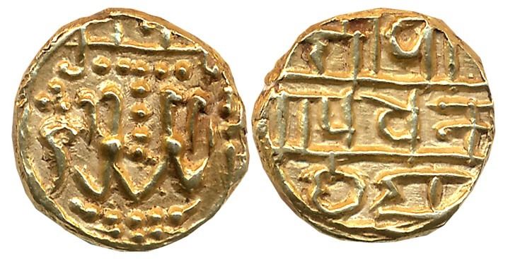 Alupas of Udipi / Alvakheda, Gold Gadyana, 3.59g, in the name of ‘Pandya Dhananjaya’, Obv: Alupa dynastic emblem - two vertical Fish above the lotus, beneath the umbrella, flanked by a conch-shell (Shankha) and a dagger (Katar), Rev: Nandi nagari legend “Sri Pa / ndya Dhanam / jaya” in three lines with dividing lines, all within a circular border (G Prabhu# 39, K. Ganesh# 4.18). Extremely fine, very rare.