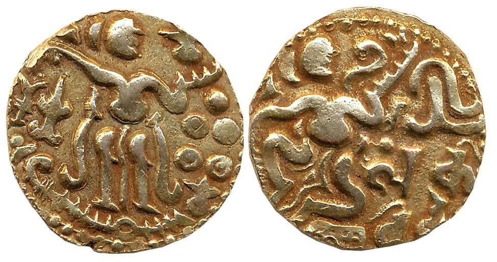Ceylon, Sri Lankan Kings, Gold Kahavanu, 4.33g, Anonymous, “Chola standard seated King” type, Obv: King seated right, arm on right raised and holding conch-shell with legend “Shri / Lanka / Vibhu (stands for - Fortunate Lord of Sri Lanka)”, Rev: King enthroned, facing right, Votive lamps and Flower symbol on the right and Lamp, Alter on the left. Tiger skin below his legs (Mitch# 311). Extremely fine. rare