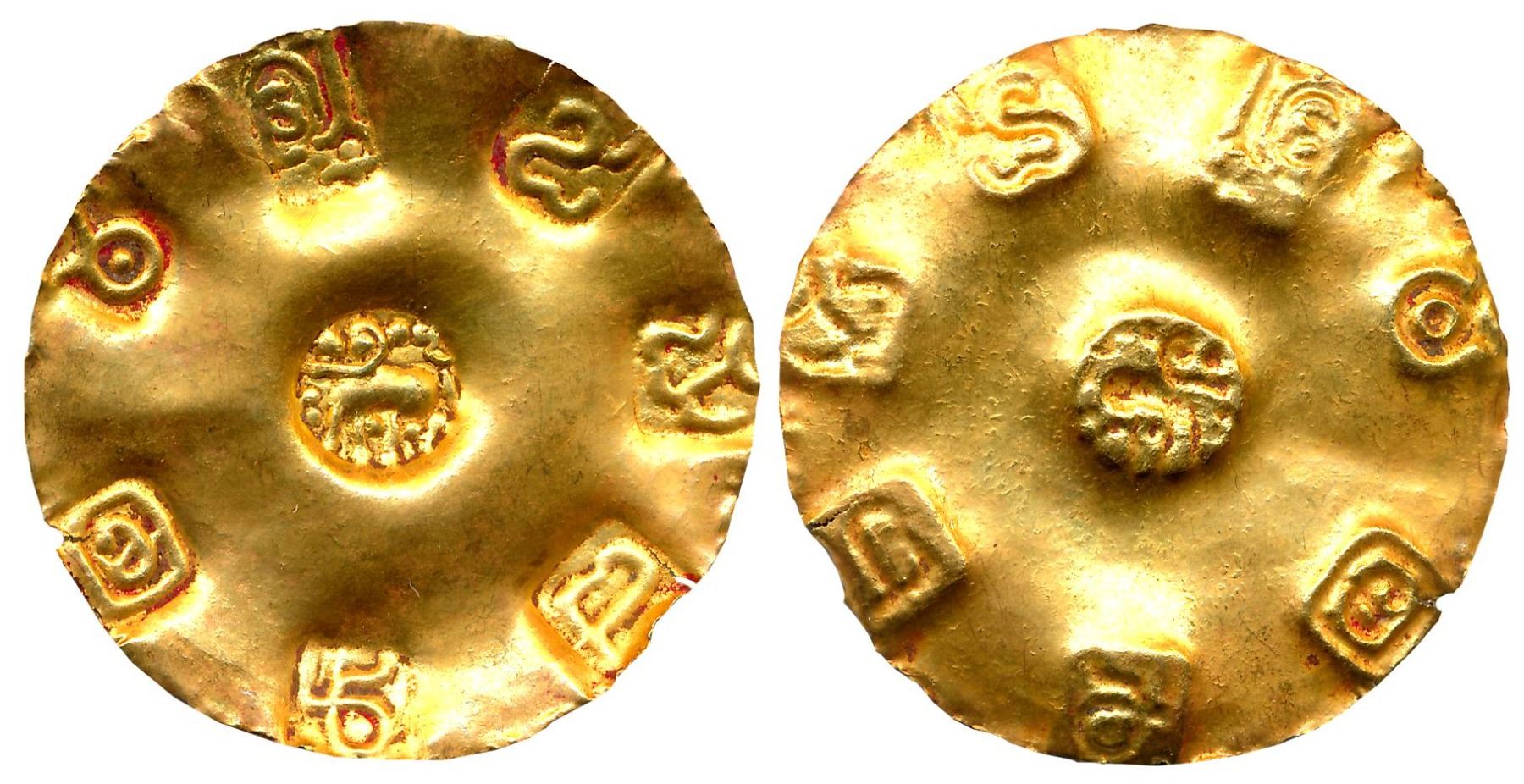 Chindaka Nagas, Someshvaradeva, Gold Gadyana, 3.82g, 33mm, Bracteate repousse Uniface, 7x circumfluent Kannada punches that reads “Sri Rajabhushana”, 1X central punch with Tiger-calf crest along with Sun and moon symbols above. Tiger and Calf is shown standing facing left on obverse (Ref: Govindraya Prabhu Sanoor, Chindaka Nagas, JONS 162, p. 17). Extremely fine, extremely rare.