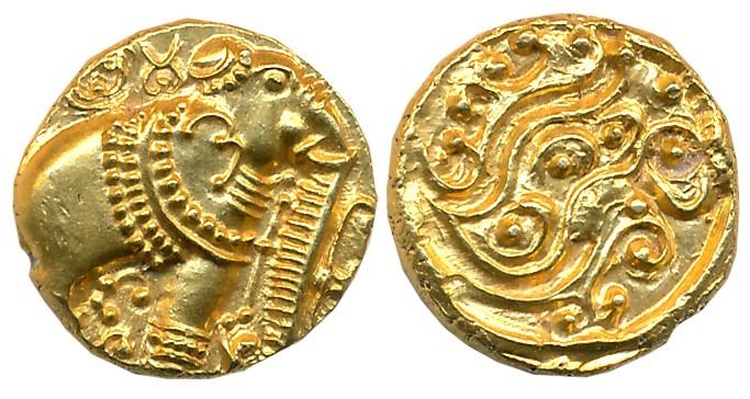 Gangas of Talakadu, Gold Gajapati Varaha, 3.94g, Obv: An ornate Elephant standing to right, Kannada letter “Shri & Ma” above, Rev: Scroll work (Mitch# 193). About uncirculated, rare in this grade.