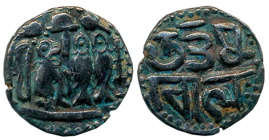Imperial Cholas, Uttama Chola, Base Silver Kahavanu, 4.38g, Obv: Within border of dots, under Parasol flanked by 2 flywhisks, the following figures from left to right, a lampstand, a strung bow, a Tiger, 2 Fishes & another lampstand, Rev: Devnagari legend “U tta ma / Cho lah” within border of dots (K Ganesh # 1.3). Extremely fine, rare.