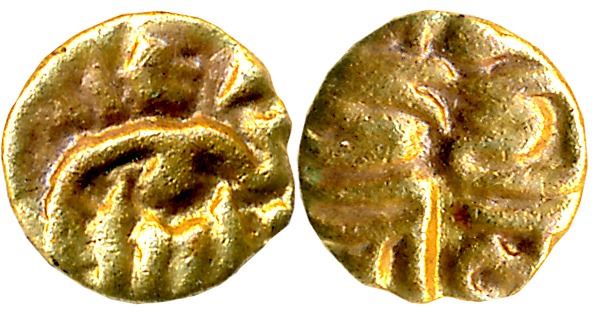 Imperial Cholas, Raja Raja I, Gold 1/2 Fanam, 0.16g; Obv: King enthroned facing right and holding Conch in his left hand. Rev: Devnagari legend ‘Jaya Chola’ (K. Ganesh# 1.8). Very fine, rare.