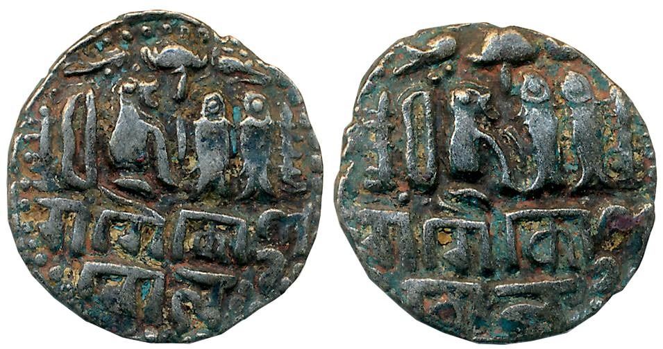Imperial Cholas, Rajendra Chola I, Silver Kahavanu, 4.33g, within border of dots, under Parasol flanked by 2 flywhisks, the following figures from left to right, a lampstand, a strung bow, a Tiger, 2 fishes & another lampstand below, Devnagari legend “Gangaikonda Chola” on both sides (K Ganesh # 1.41). Extremely fine, rare.