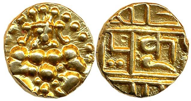 Naykas of Chitradurga, Gold Durgi Varaha, 3.28g, Obv: Lord Bal Krishna seated facing front within dotted border, Rev: Three line Devnagari legend “Shri Krishna Raya” (Mitch# 882). Extremely fine.